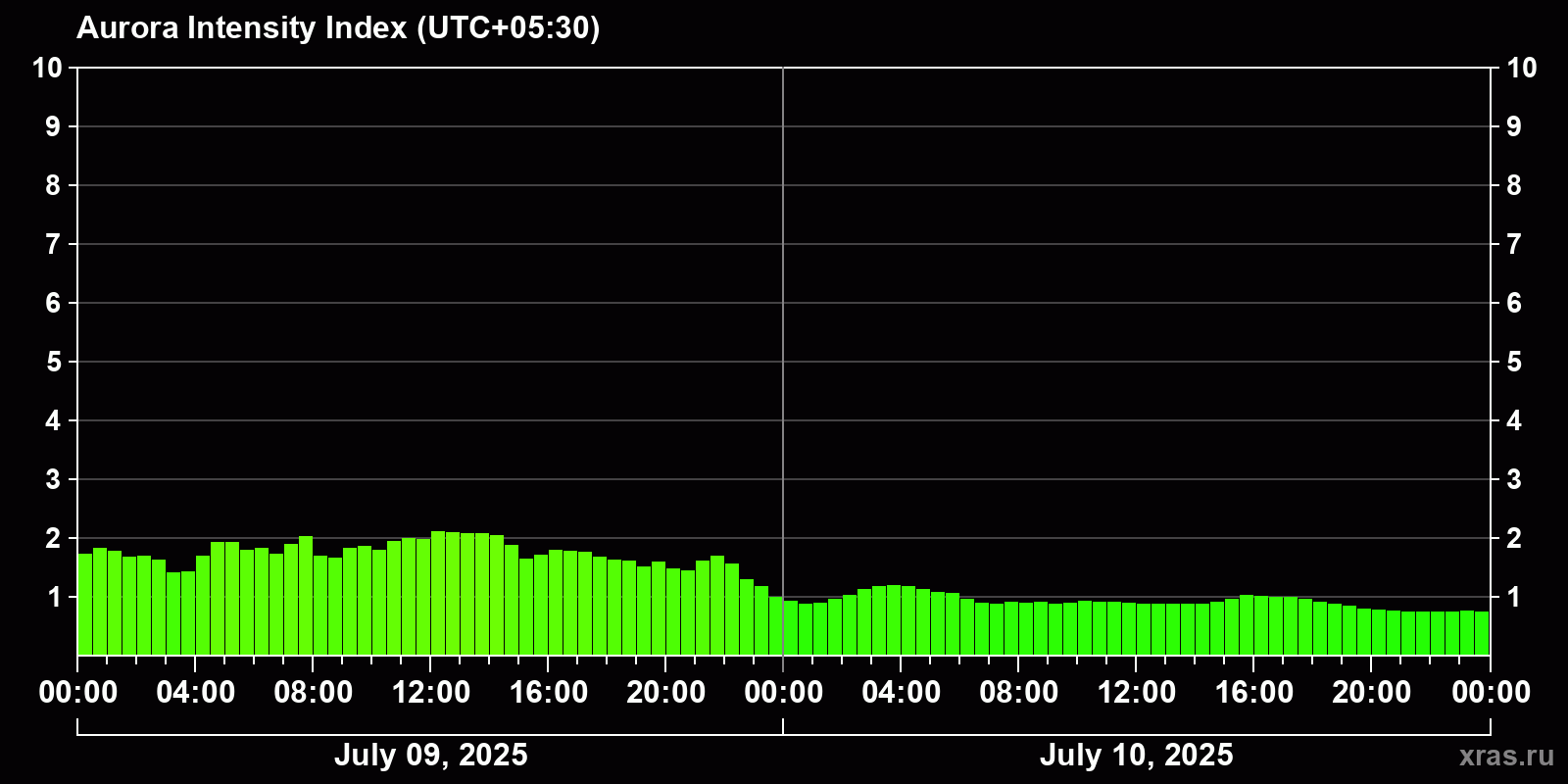 Auroral intensity index and the theoretically possible latitude of observations for nighttime in the Estern Hemisphere as of 2025-07-10 23:55 (end of day) local time
