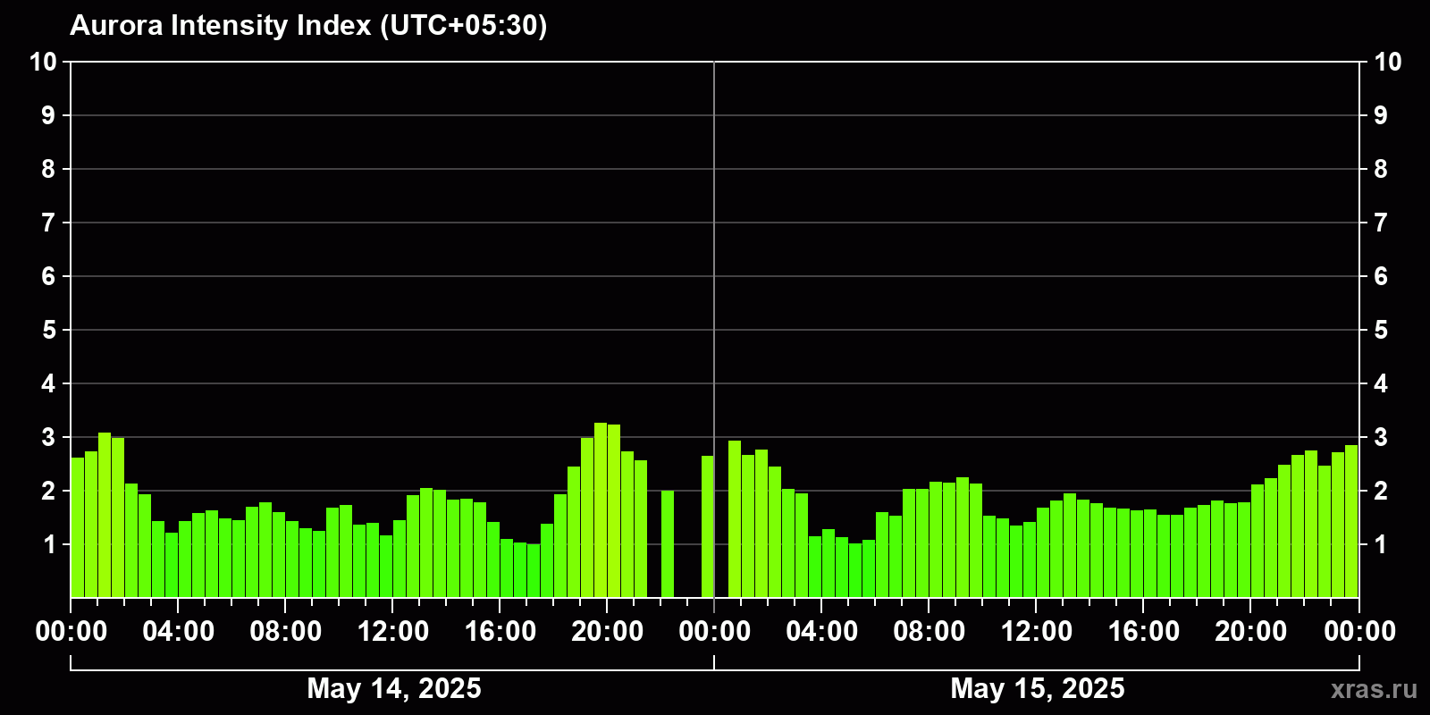Changes in the auroral intensity index from 2025-05-14 to 2025-05-15 local time