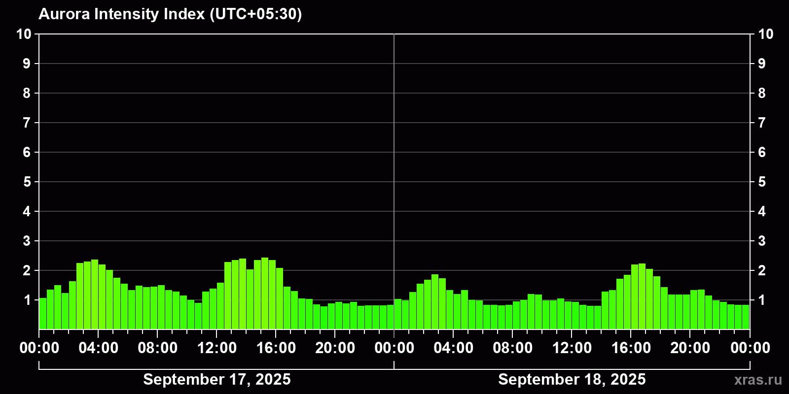 Auroral intensity index and the theoretically possible latitude of observations for nighttime in the Estern Hemisphere as of 2025-09-18 23:47 (end of day) local time