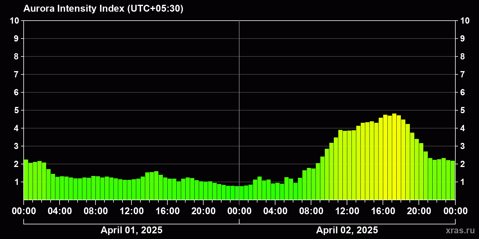 Changes in the auroral intensity index from 2025-04-01 to 2025-04-02 local time