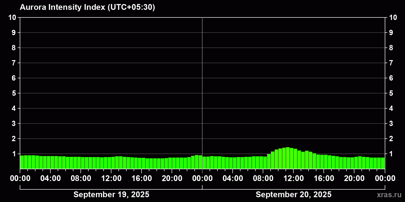 Auroral intensity index and the theoretically possible latitude of observations for nighttime in the Estern Hemisphere as of 2025-09-20 23:48 (end of day) local time