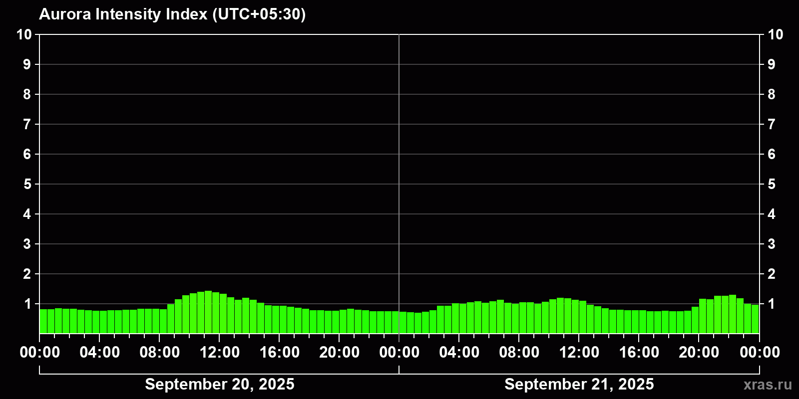 Changes in the auroral intensity index from 2025-09-20 to 2025-09-21 local time
