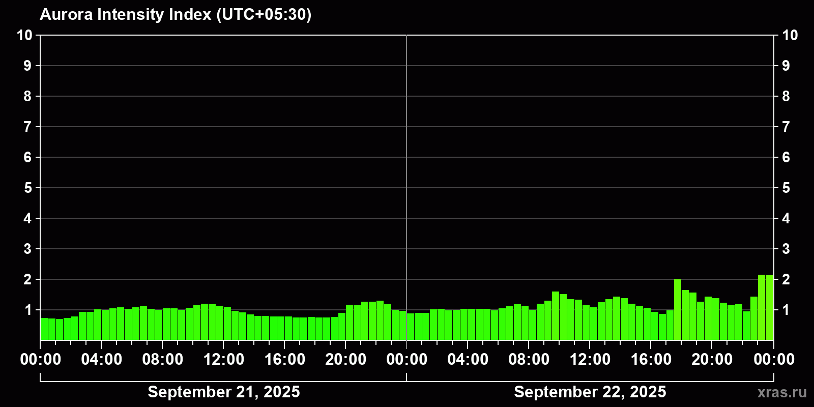 Auroral intensity index and the theoretically possible latitude of observations for nighttime in the Estern Hemisphere as of 2025-09-22 23:51 (end of day) local time