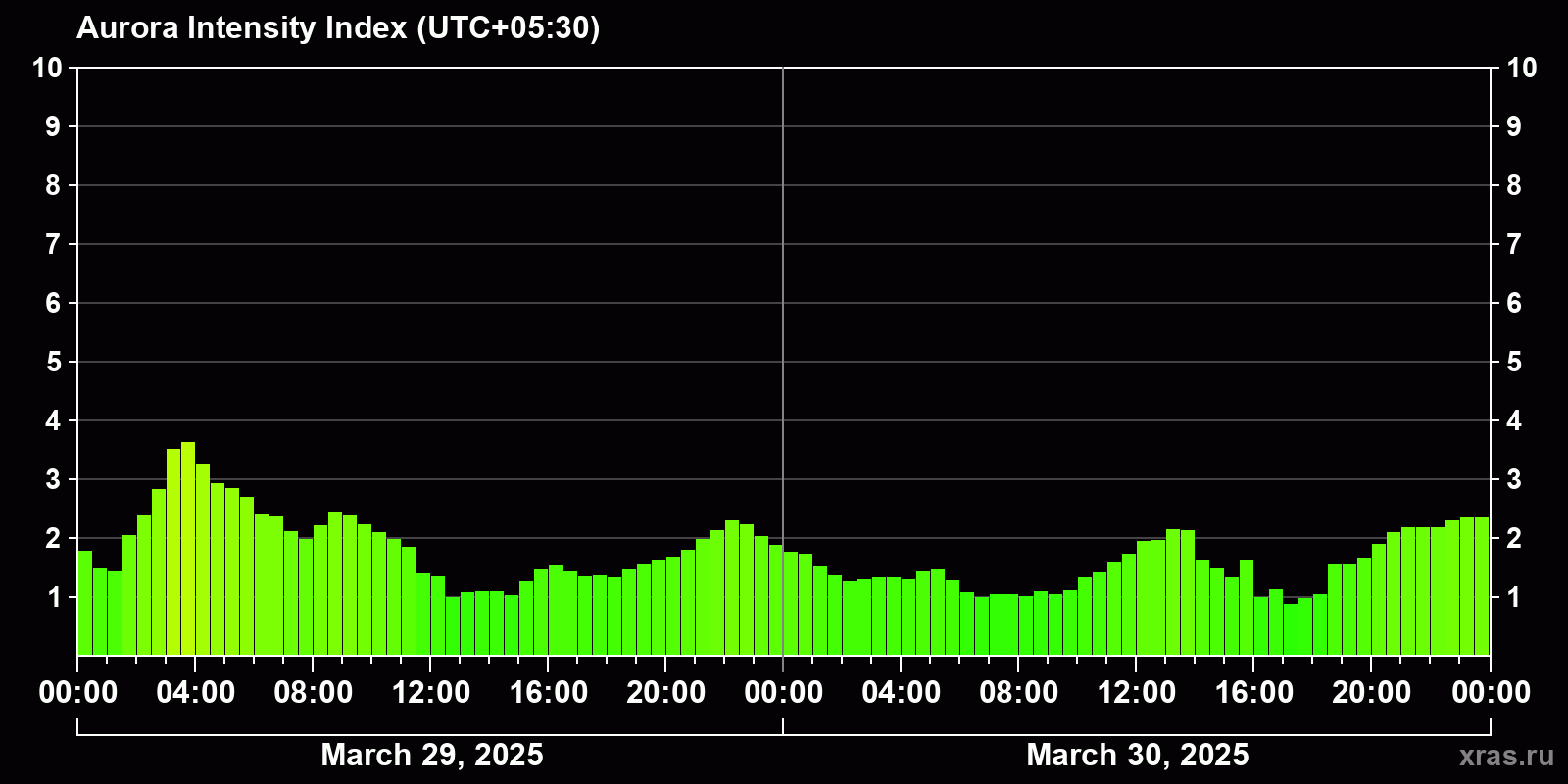 Auroral intensity index and the theoretically possible latitude of observations for nighttime in the Estern Hemisphere as of 2025-03-30 23:47 (end of day) local time