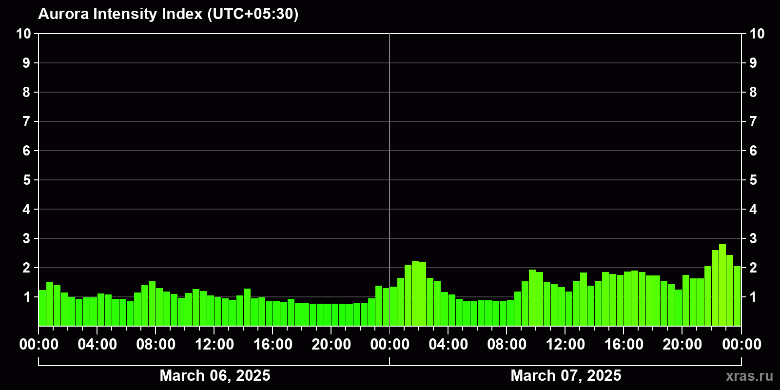 Changes in the auroral intensity index from 2025-03-06 to 2025-03-07 local time