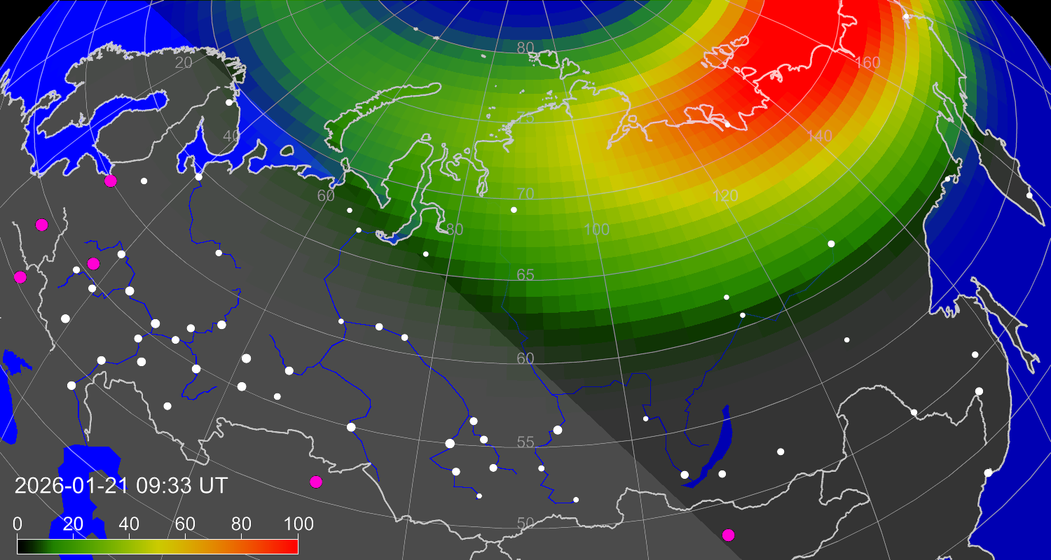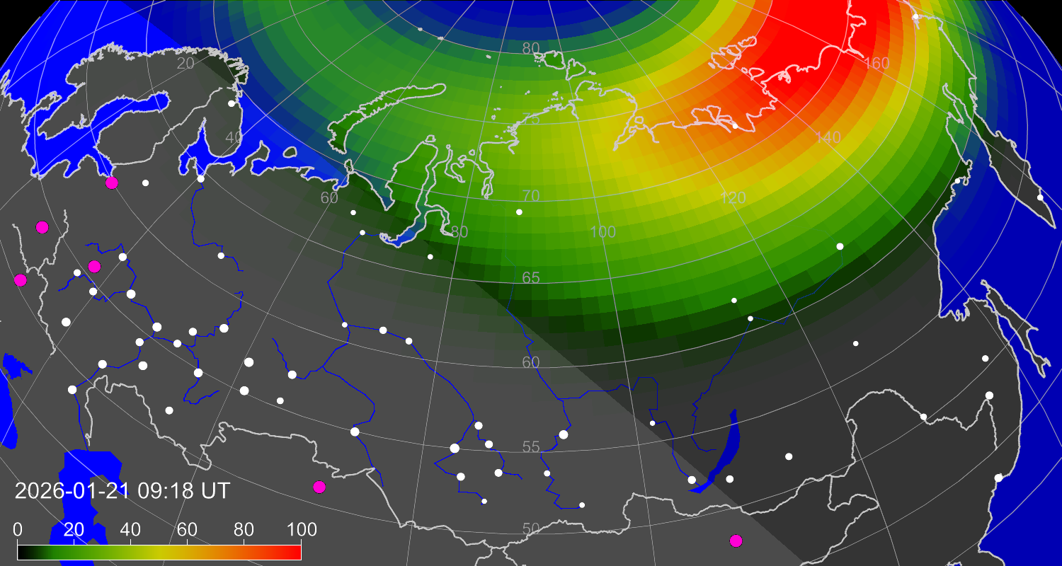 Индекс интенсивности полярных сияний и теоретически возможная широта наблюдений для ночного времени в восточном полушарии