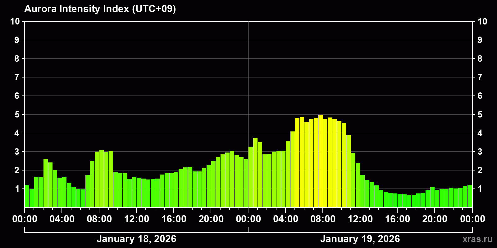 Auroral intensity index and the theoretically possible latitude of observations for nighttime in the Estern Hemisphere as of 2026-01-19 23:56 (end of day) local time