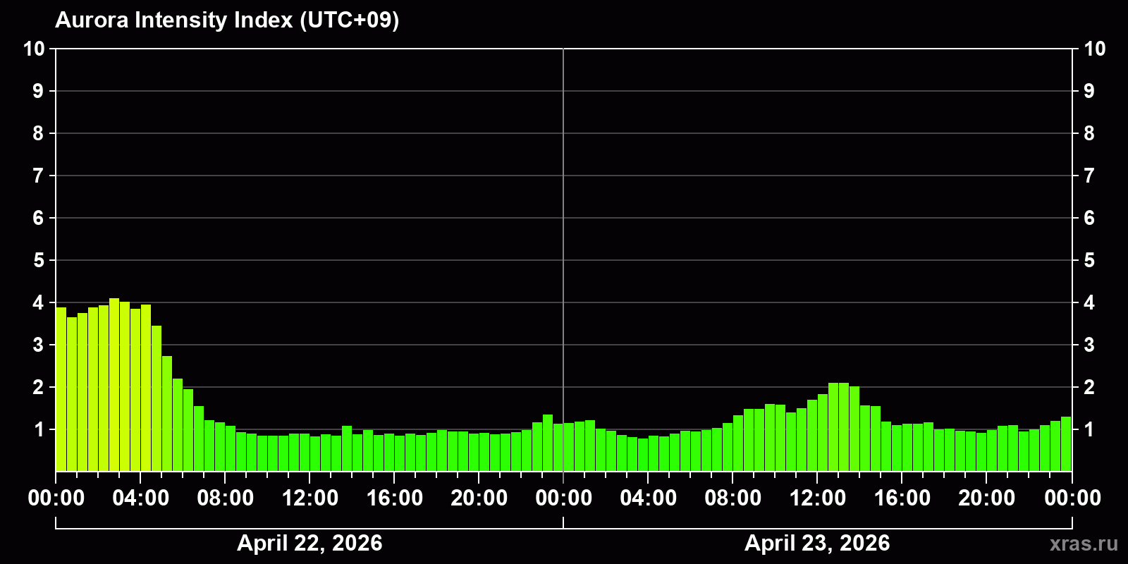 Changes in the auroral intensity index from 2026-04-22 to 2026-04-23 local time