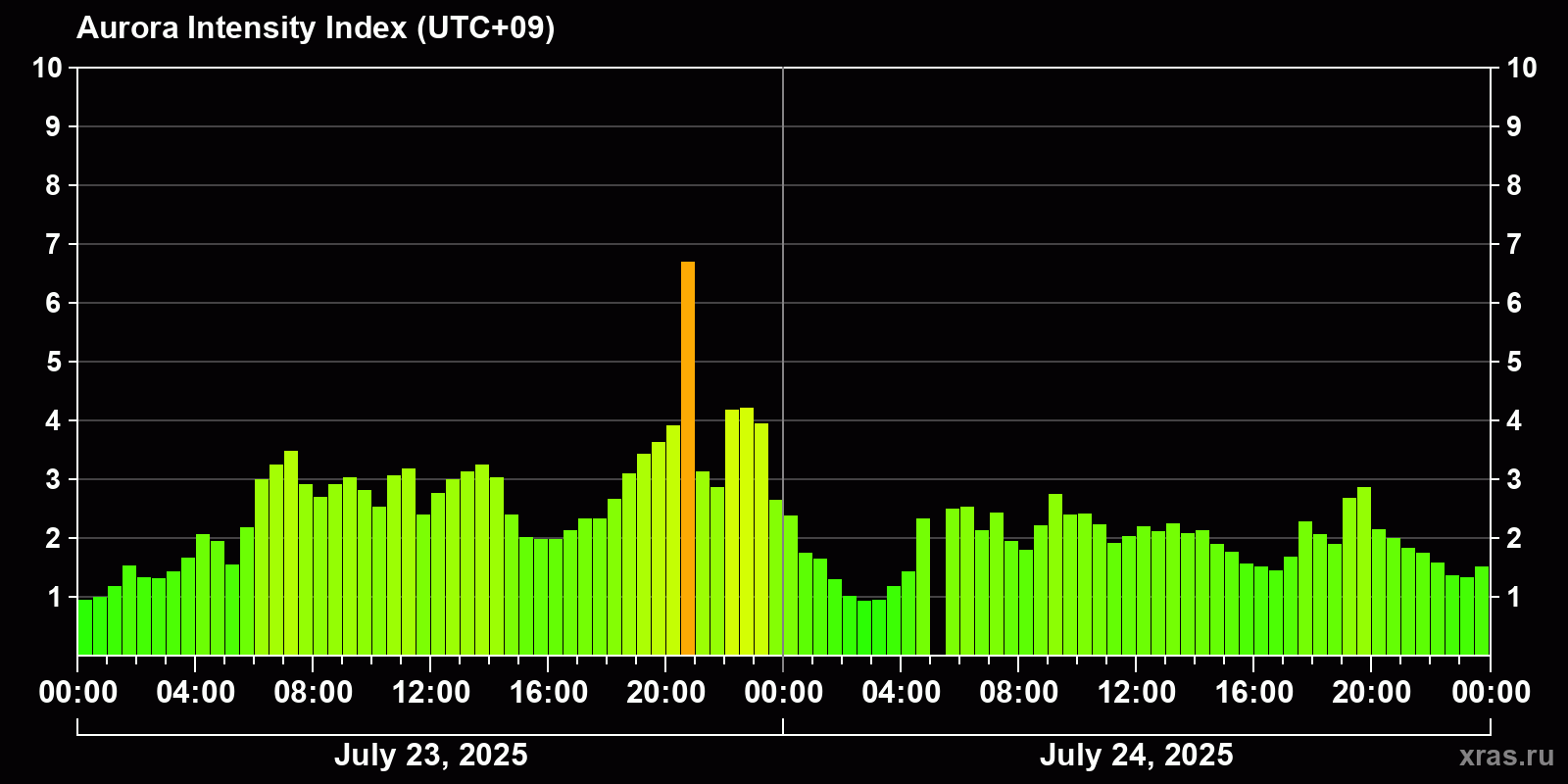 Auroral intensity index and the theoretically possible latitude of observations for nighttime in the Estern Hemisphere as of 2025-07-24 23:50 (end of day) local time