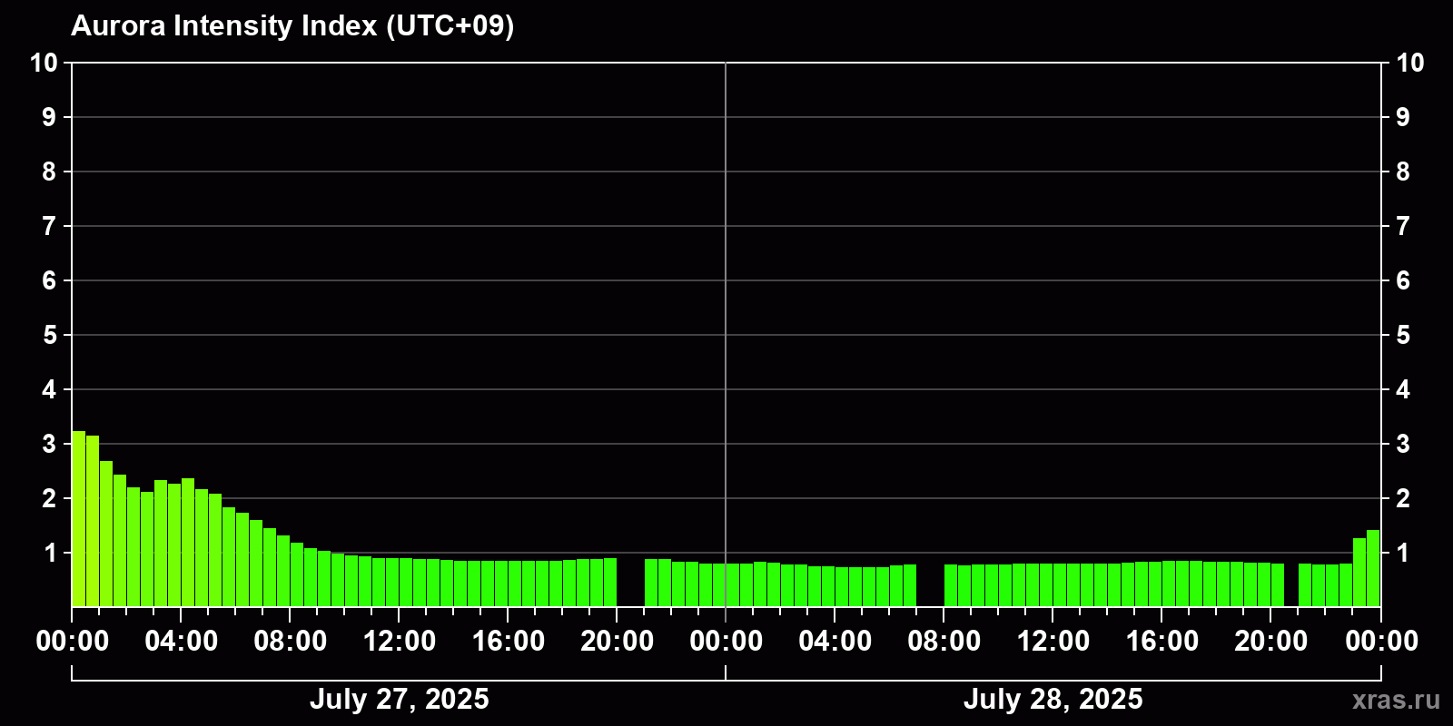 Changes in the auroral intensity index from 2025-07-27 to 2025-07-28 local time