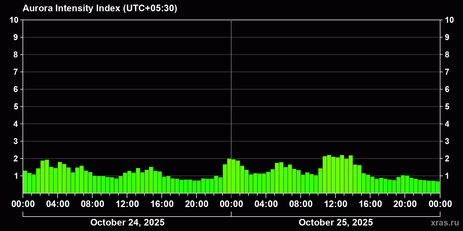 Changes in the auroral intensity index from 2025-10-24 to 2025-10-25 local time