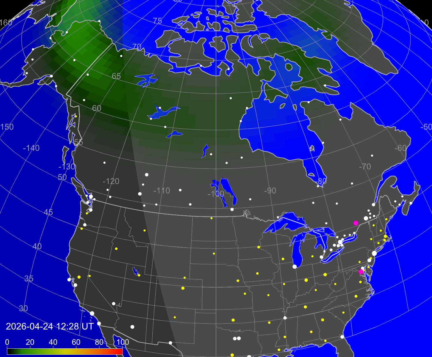 Probability of northern lights (auroras) in cities of United States
