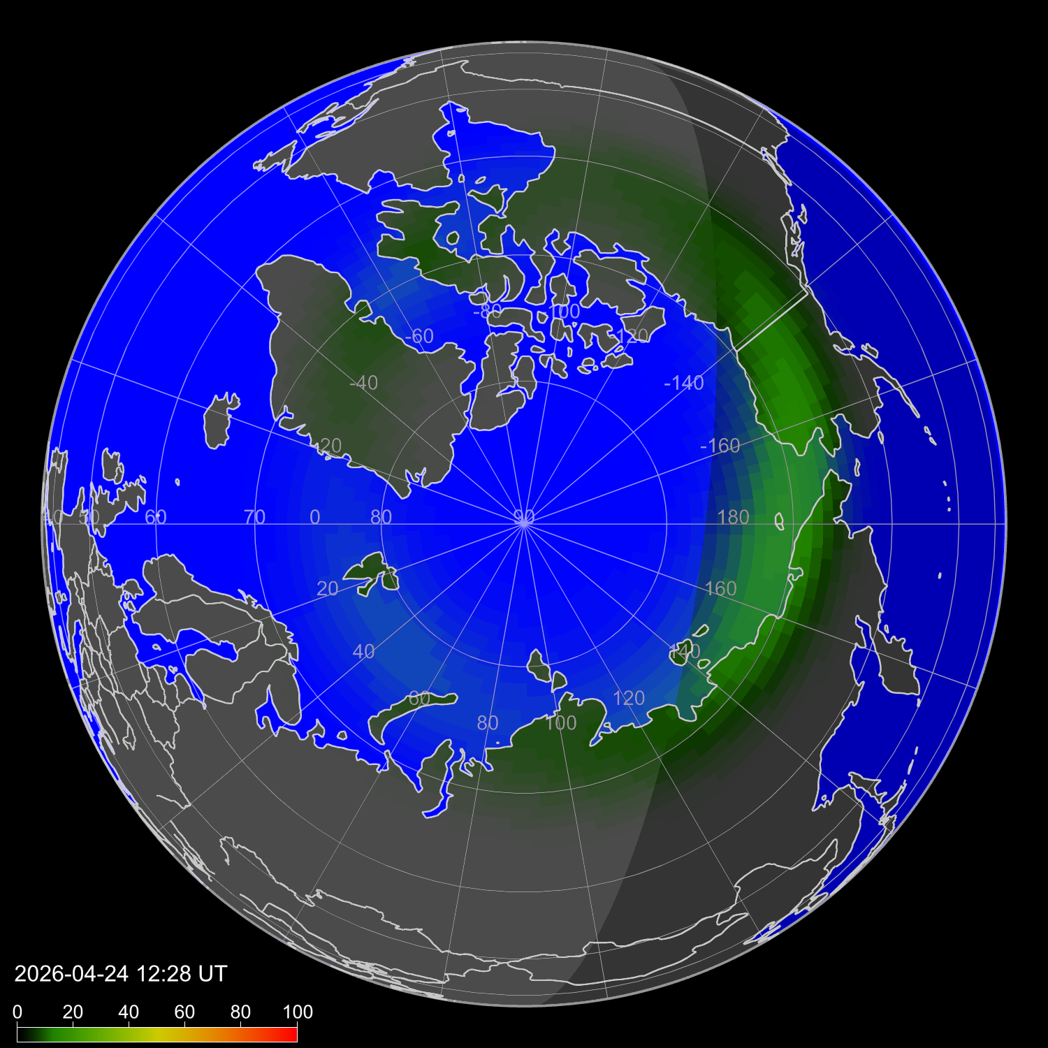 Auroral intensity index and theoretically possible latitude of observations for nighttime in the Western Hemisphere