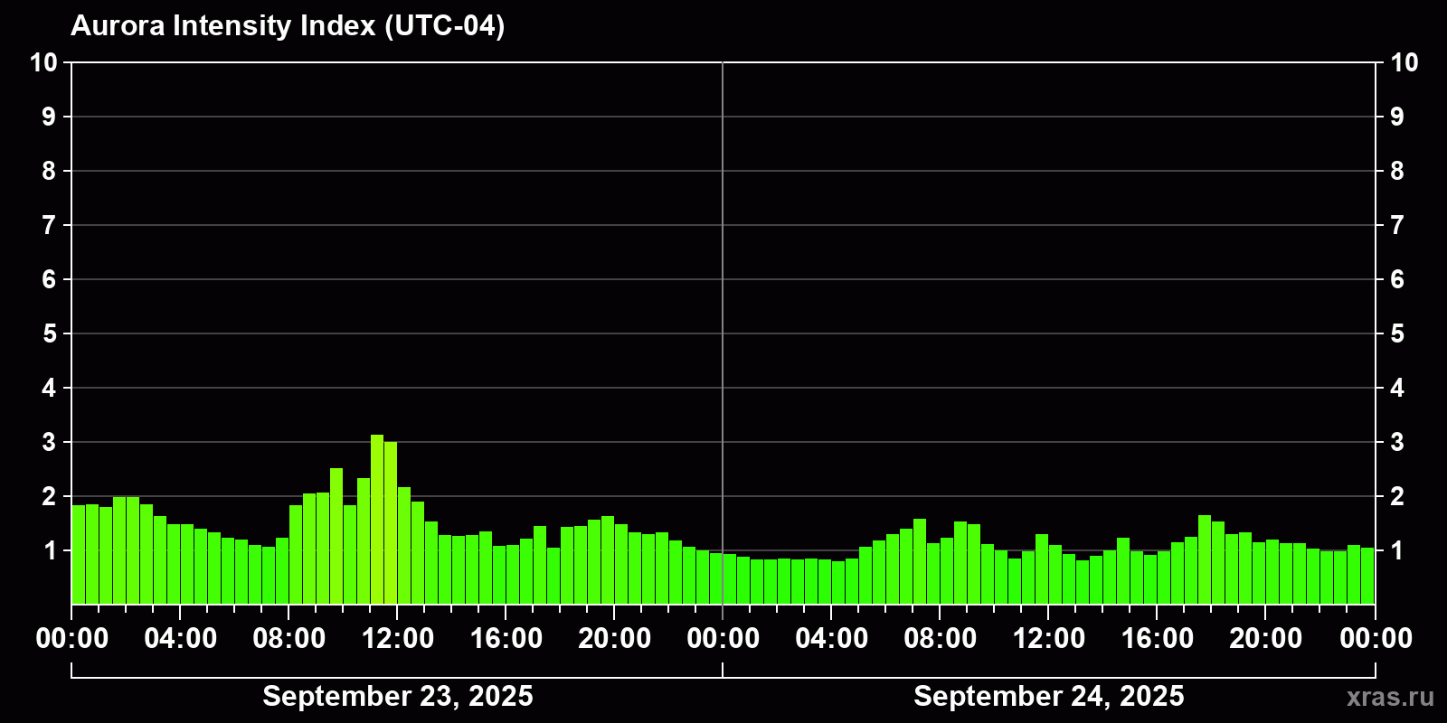 Auroral intensity index and the theoretically possible latitude of observations for nighttime in the Western Hemisphere as of 2025-09-24 23:49 (end of day) local time