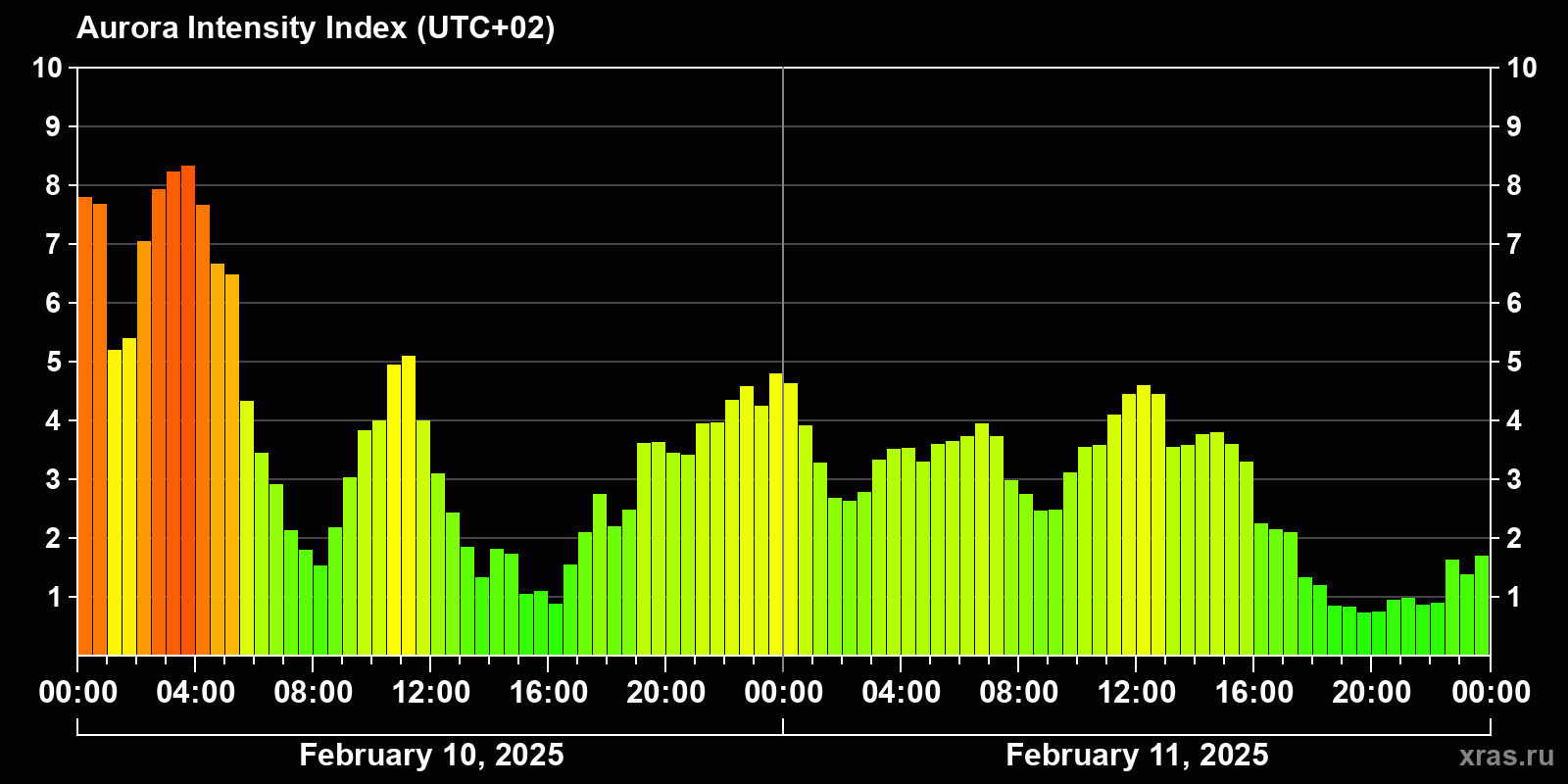 Auroral intensity index and the theoretically possible latitude of observations for nighttime in the Estern Hemisphere as of 2025-02-11 23:58 (end of day) local time