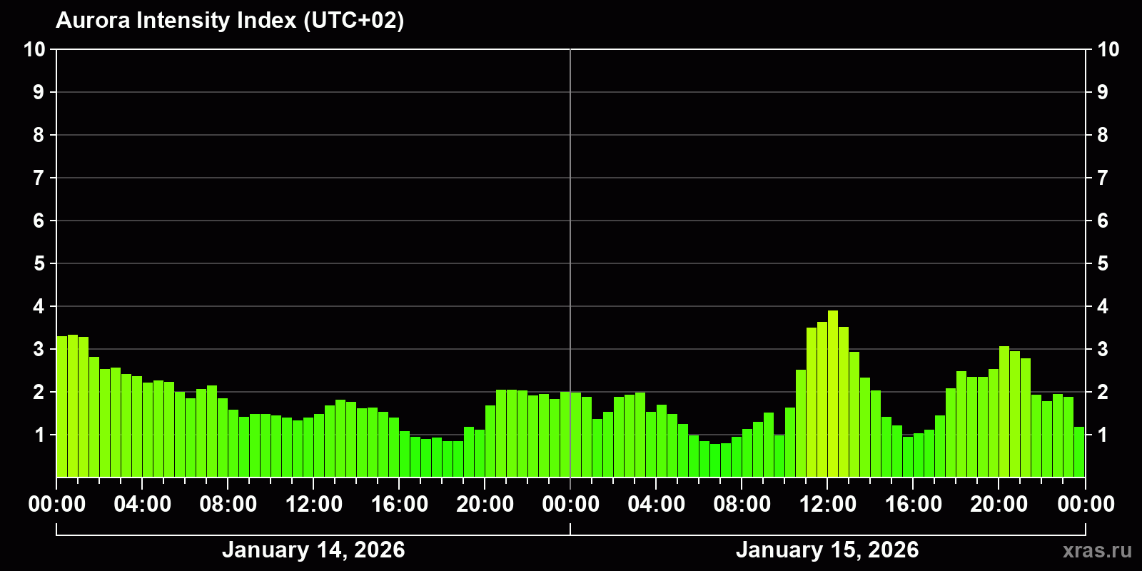 Auroral intensity index and the theoretically possible latitude of observations for nighttime in the Estern Hemisphere as of 2026-01-15 23:55 (end of day) local time