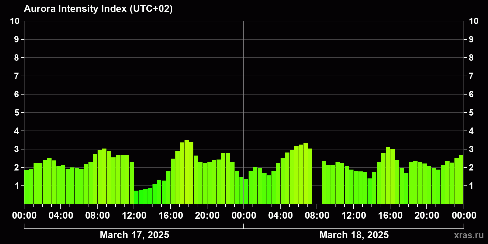 Auroral intensity index and the theoretically possible latitude of observations for nighttime in the Estern Hemisphere as of 2025-03-18 23:39 (end of day) local time