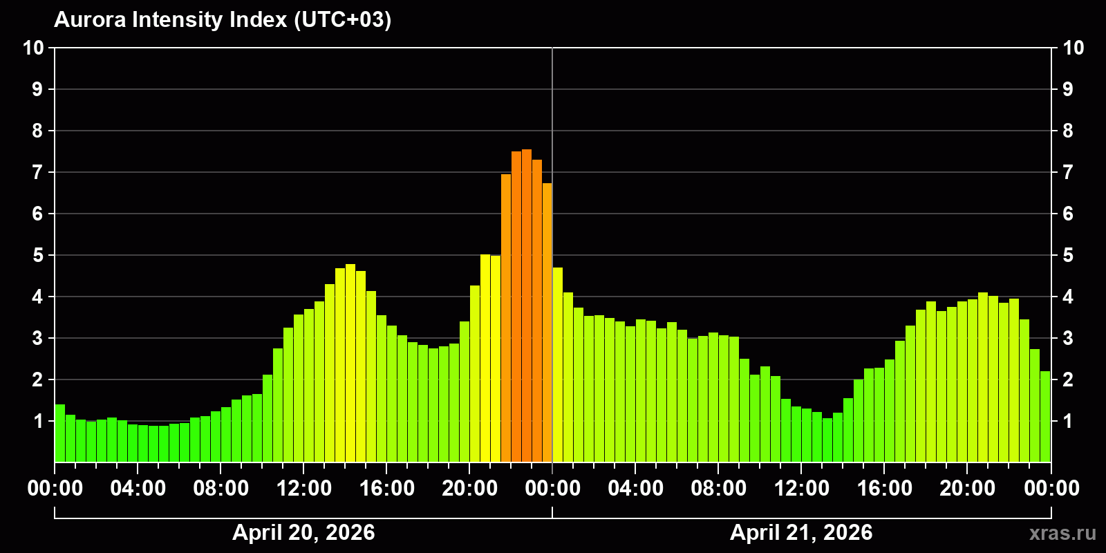 Auroral intensity index and the theoretically possible latitude of observations for nighttime in the Estern Hemisphere as of 2026-04-21 23:46 (end of day) local time