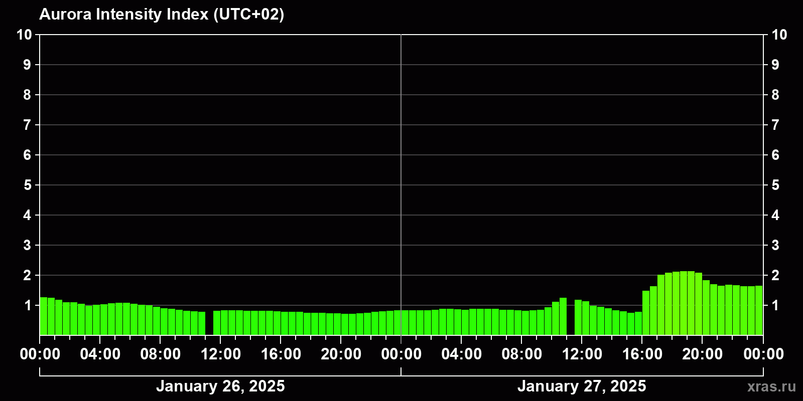 Changes in the auroral intensity index from 2025-01-26 to 2025-01-27 local time