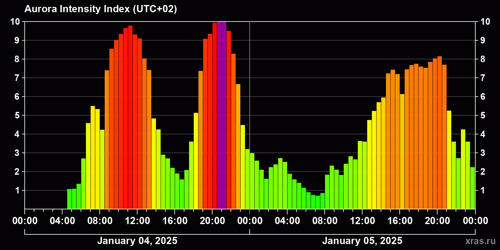 Auroral intensity index and the theoretically possible latitude of observations for nighttime in the Estern Hemisphere as of 2025-01-05 23:48 (end of day) local time