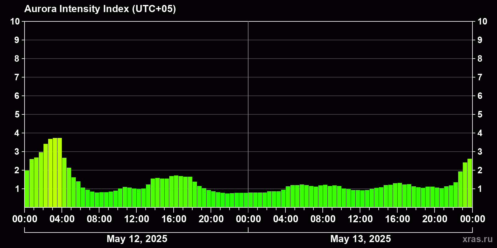 Changes in the auroral intensity index from 2025-05-12 to 2025-05-13 local time