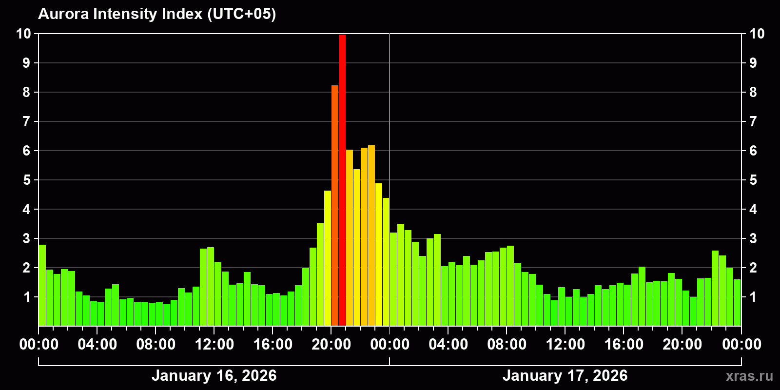Changes in the auroral intensity index from 2026-01-16 to 2026-01-17 local time