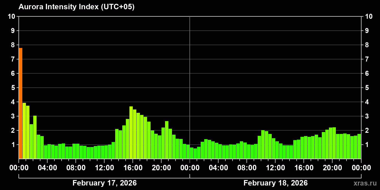 Auroral intensity index and the theoretically possible latitude of observations for nighttime in the Estern Hemisphere as of 2026-02-18 23:55 (end of day) local time
