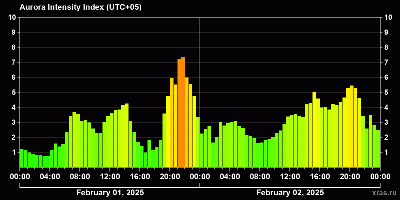 Auroral intensity index and the theoretically possible latitude of observations for nighttime in the Estern Hemisphere as of 2025-02-02 23:53 (end of day) local time