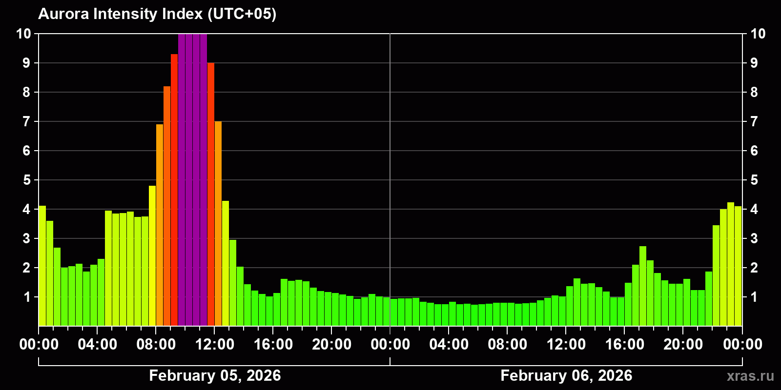 Auroral intensity index and the theoretically possible latitude of observations for nighttime in the Estern Hemisphere as of 2026-02-06 23:45 (end of day) local time