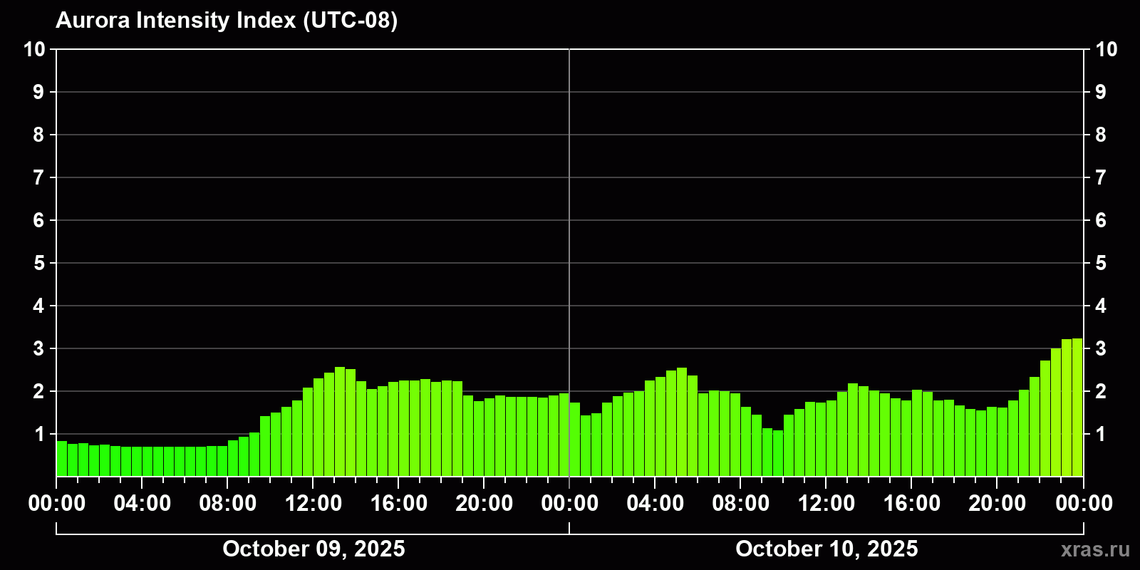 Changes in the auroral intensity index from 2025-10-09 to 2025-10-10 local time