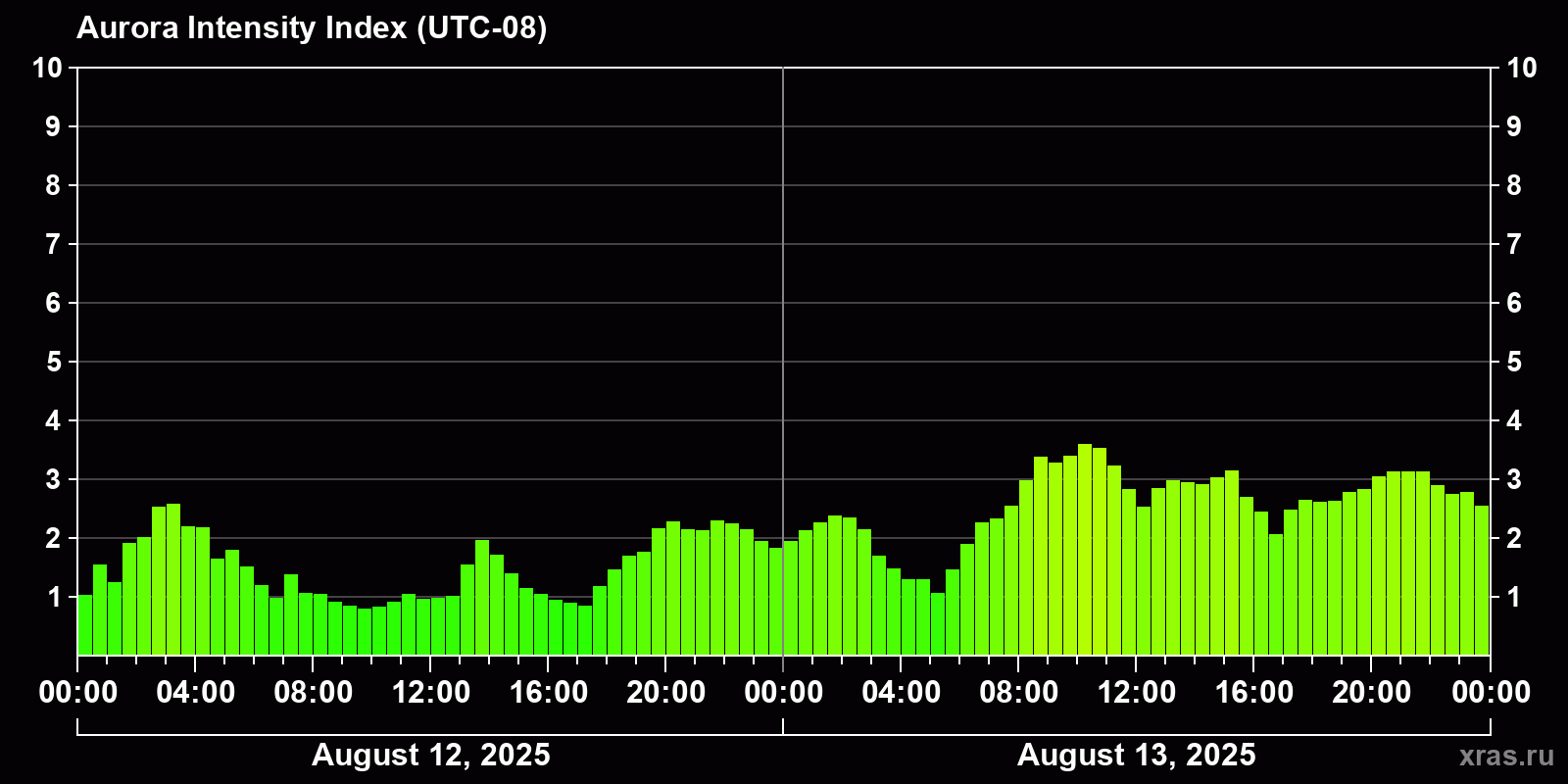 Changes in the auroral intensity index from 2025-08-12 to 2025-08-13 local time