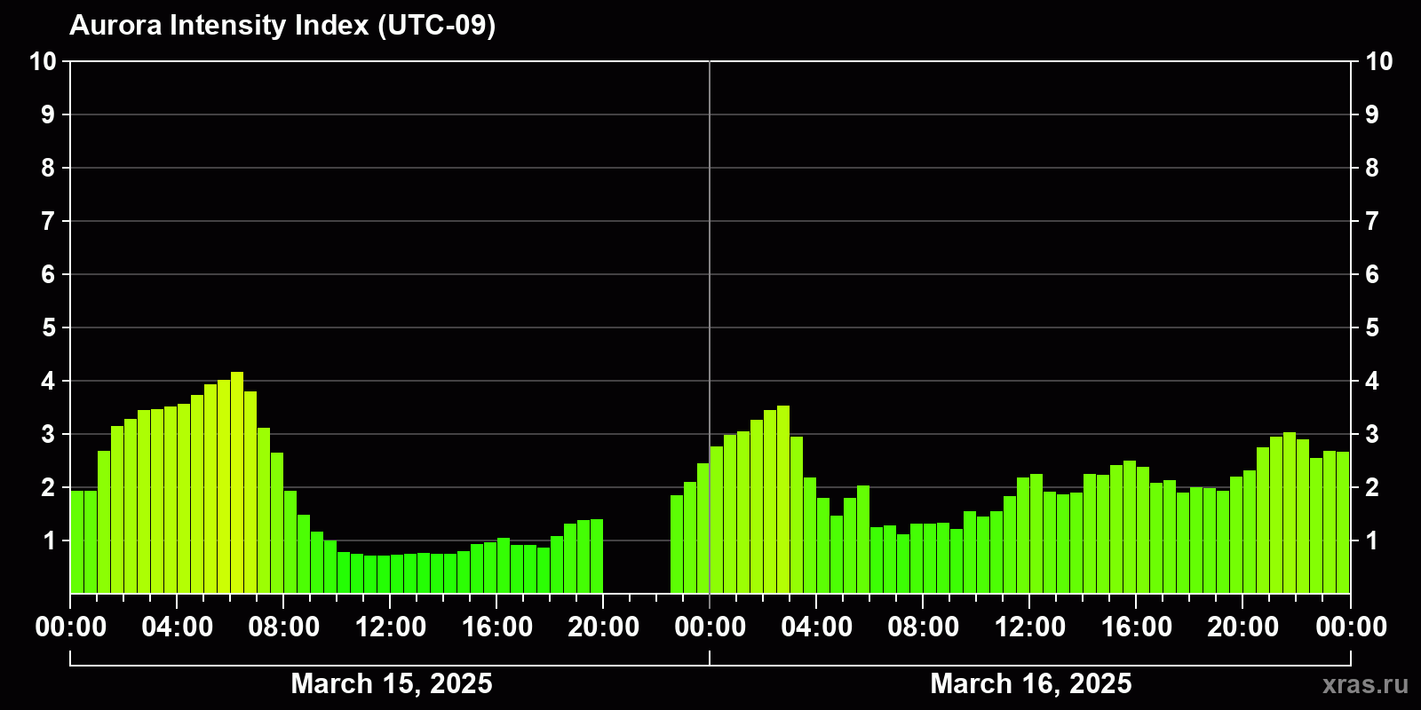Auroral intensity index and the theoretically possible latitude of observations for nighttime in the Western Hemisphere as of 2025-03-16 23:51 (end of day) local time