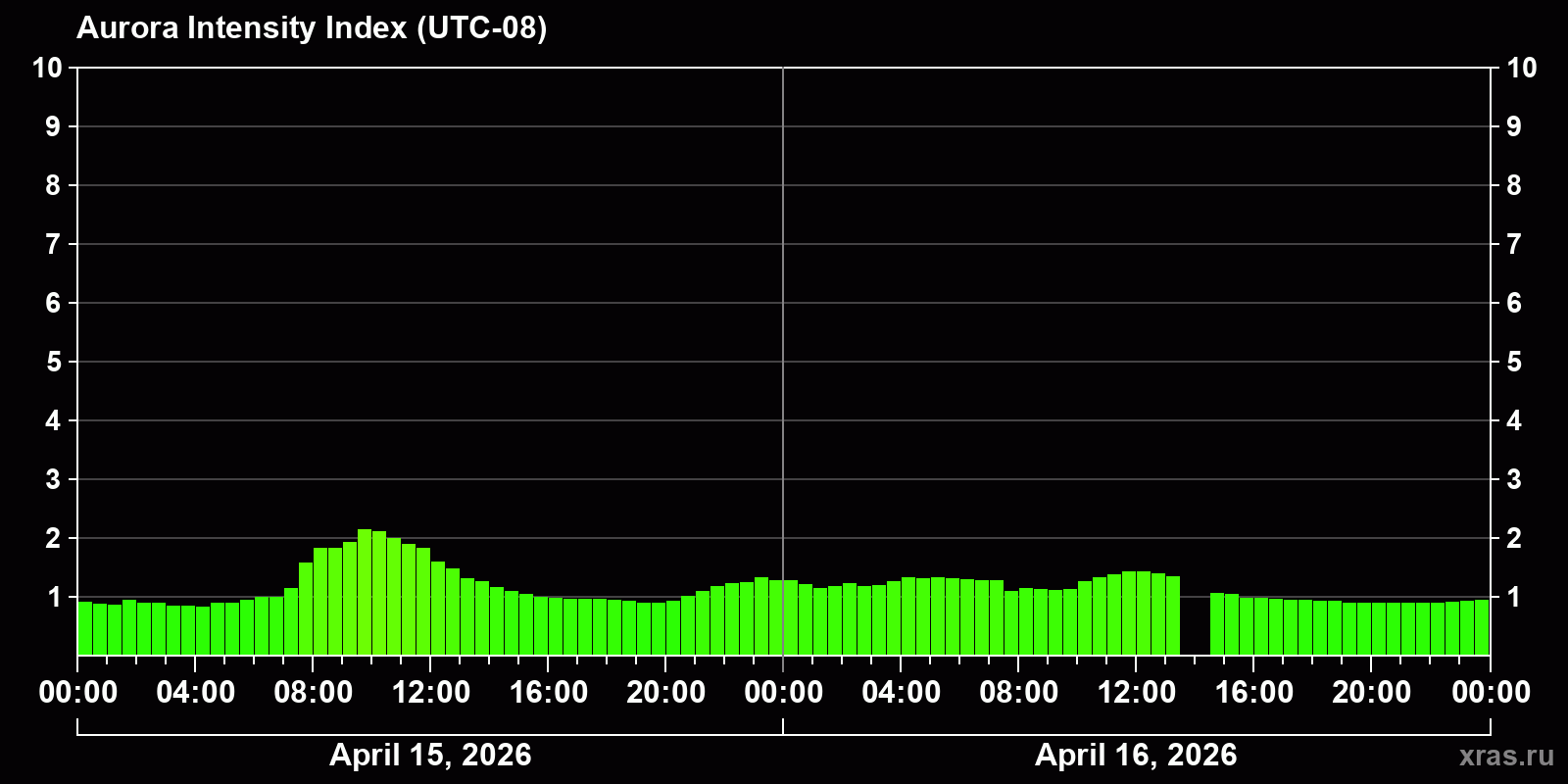 Changes in the auroral intensity index from 2026-04-15 to 2026-04-16 local time