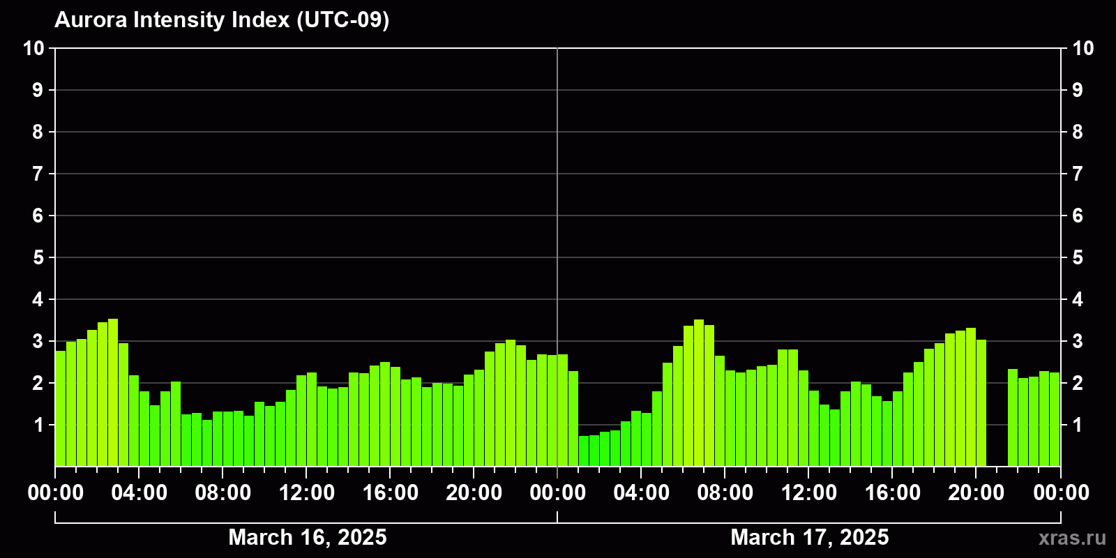 Changes in the auroral intensity index from 2025-03-16 to 2025-03-17 local time