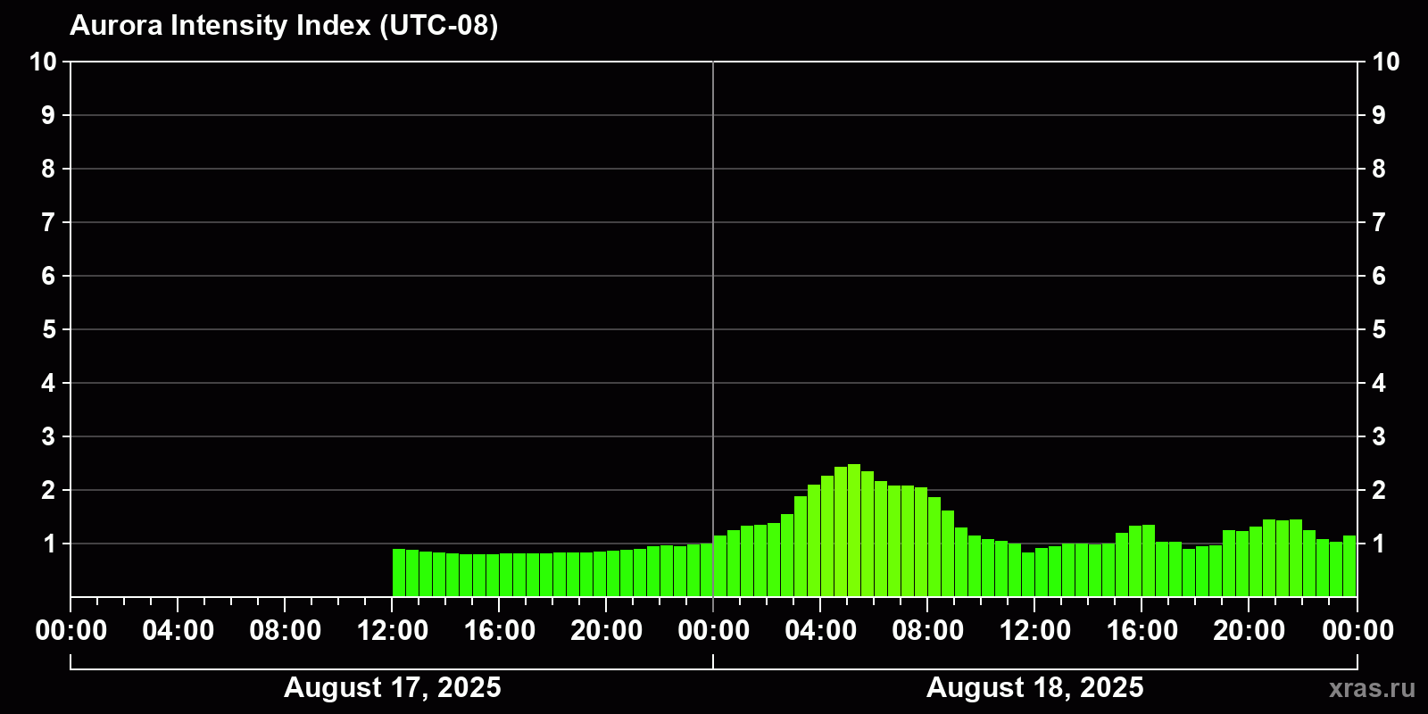 Changes in the auroral intensity index from 2025-08-17 to 2025-08-18 local time