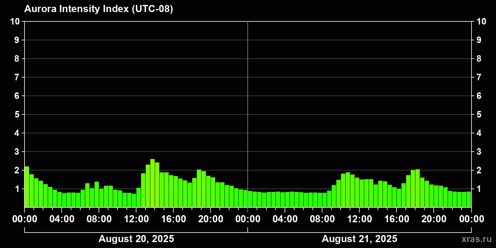 Changes in the auroral intensity index from 2025-08-20 to 2025-08-21 local time