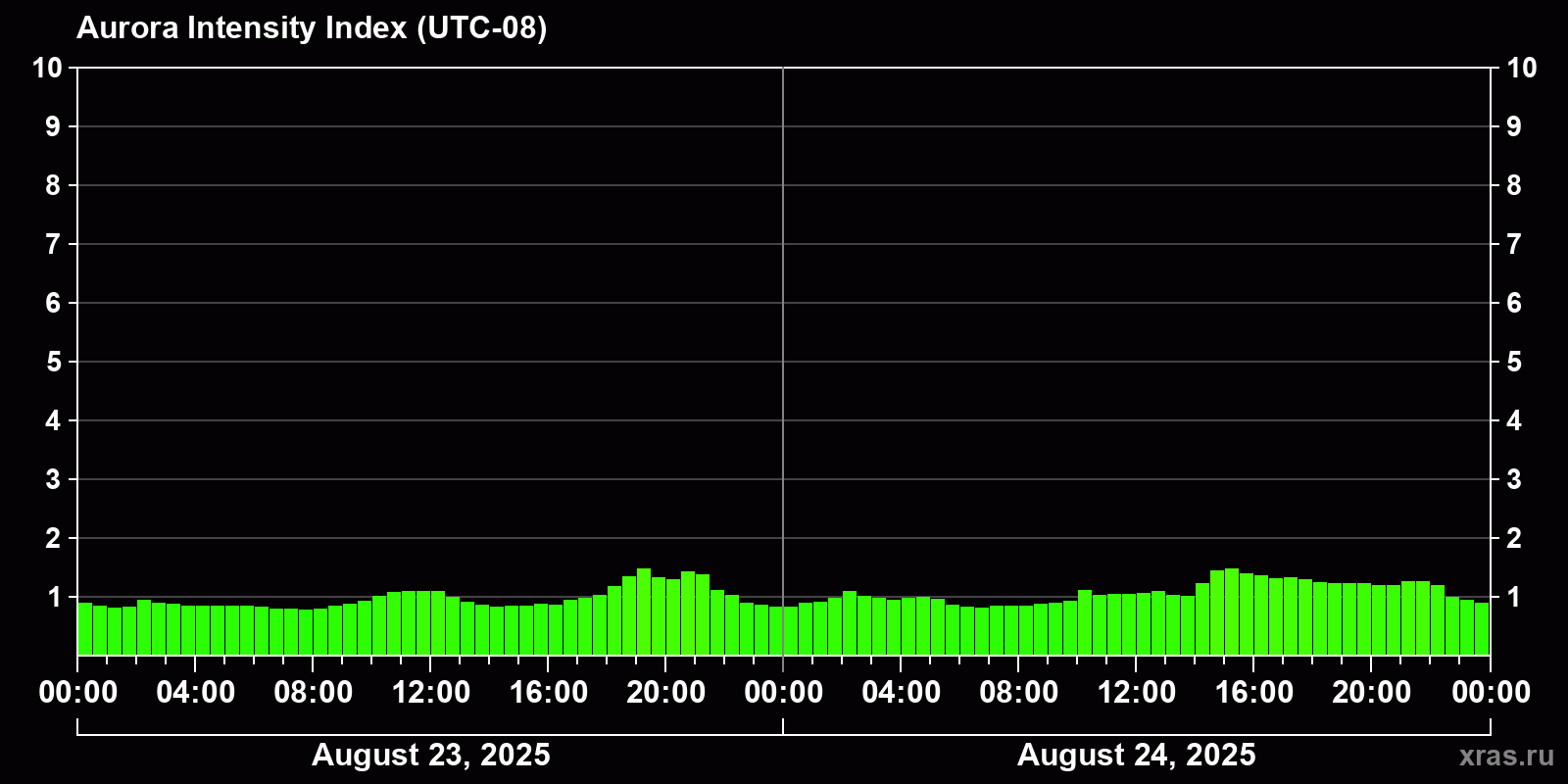 Auroral intensity index and the theoretically possible latitude of observations for nighttime in the Western Hemisphere as of 2025-08-24 23:53 (end of day) local time