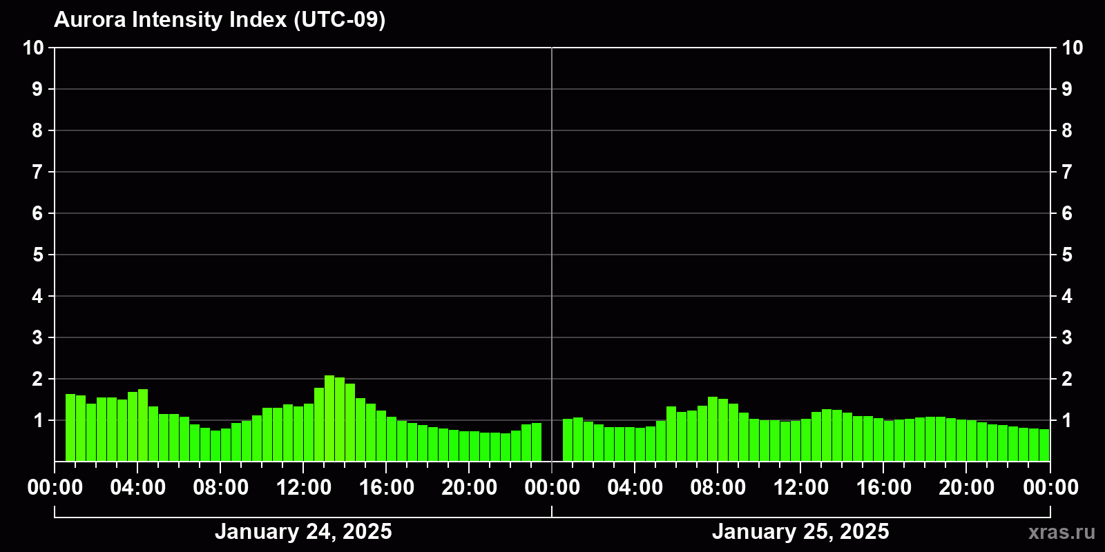 Auroral intensity index and the theoretically possible latitude of observations for nighttime in the Western Hemisphere as of 2025-01-25 23:44 (end of day) local time