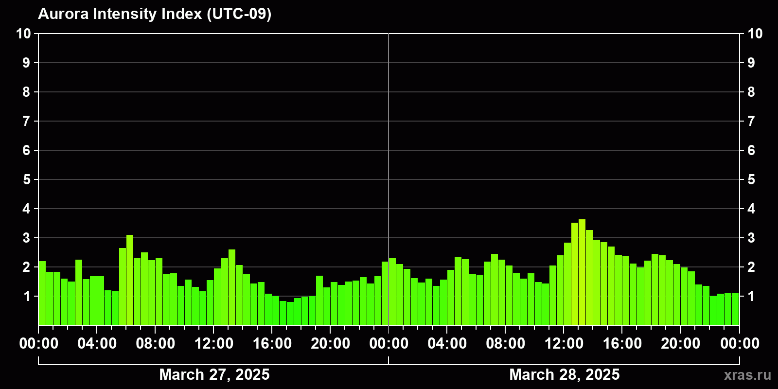 Changes in the auroral intensity index from 2025-03-27 to 2025-03-28 local time