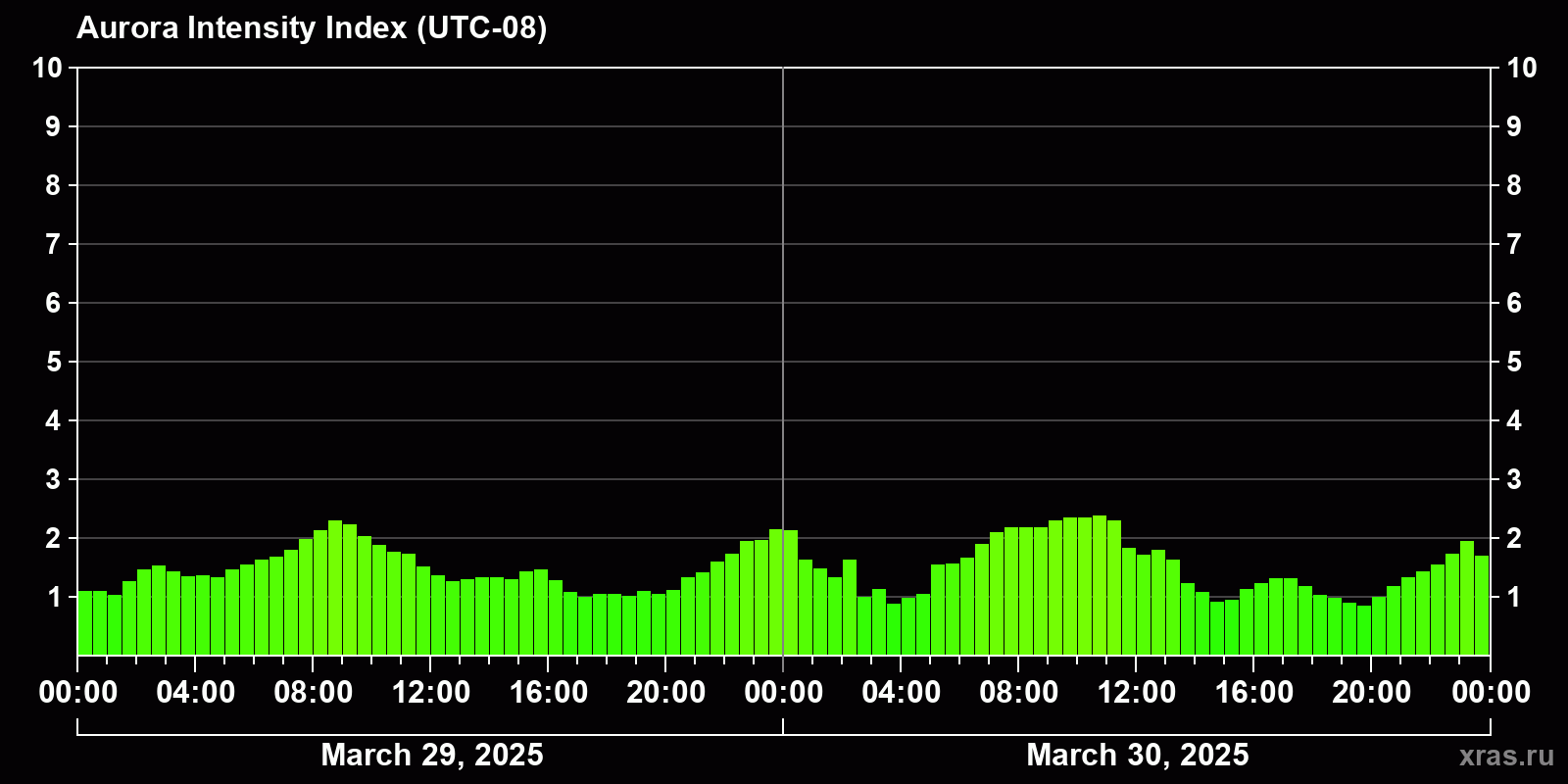 Changes in the auroral intensity index from 2025-03-29 to 2025-03-30 local time