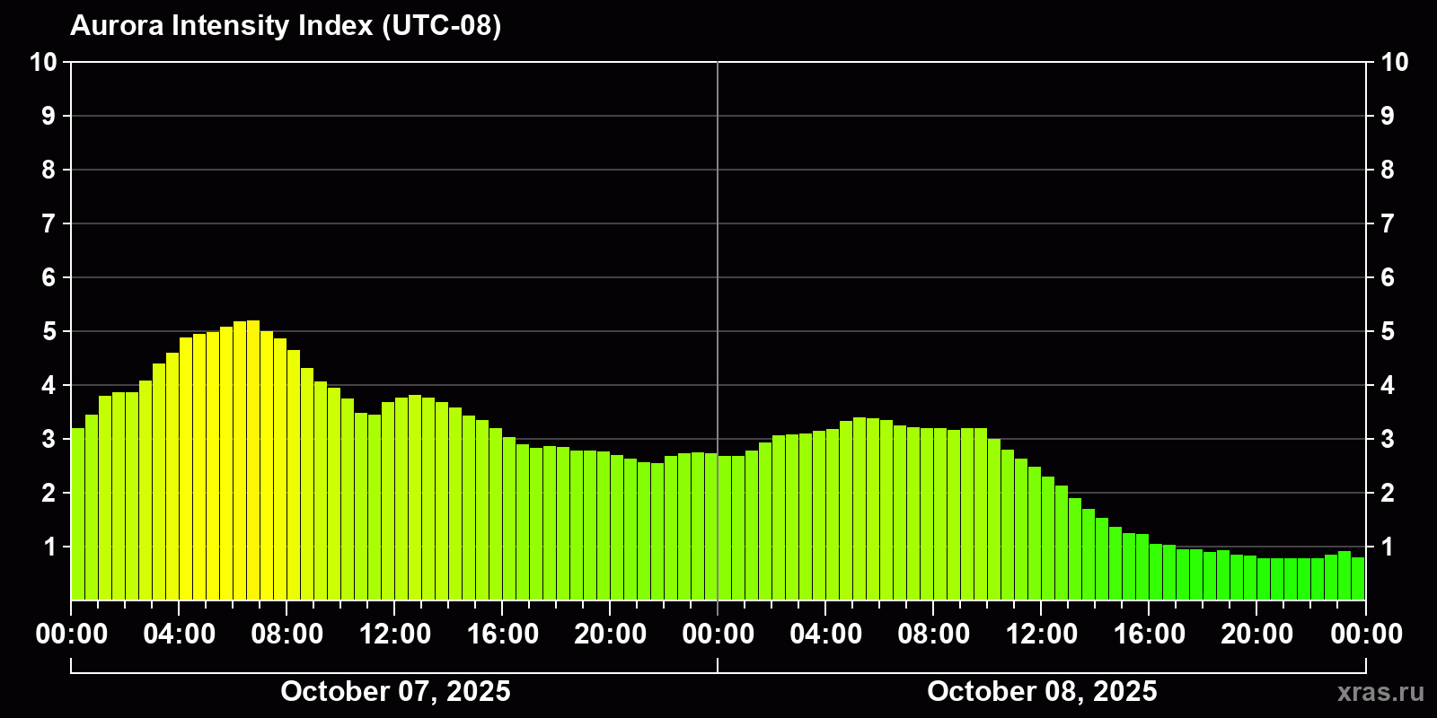 Auroral intensity index and the theoretically possible latitude of observations for nighttime in the Western Hemisphere as of 2025-10-08 23:49 (end of day) local time
