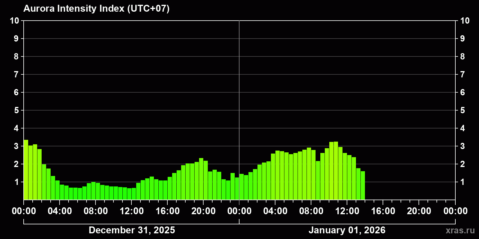 Auroras (northern lights) in Norilsk — Jan 01, 2026