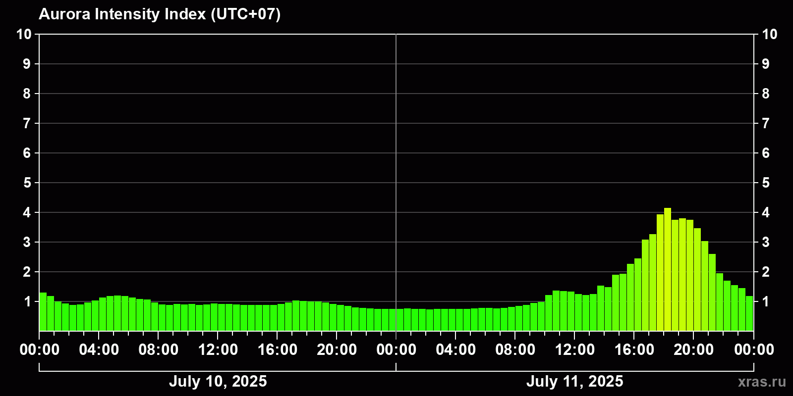 Auroral intensity index and the theoretically possible latitude of observations for nighttime in the Estern Hemisphere as of 2025-07-11 23:50 (end of day) local time
