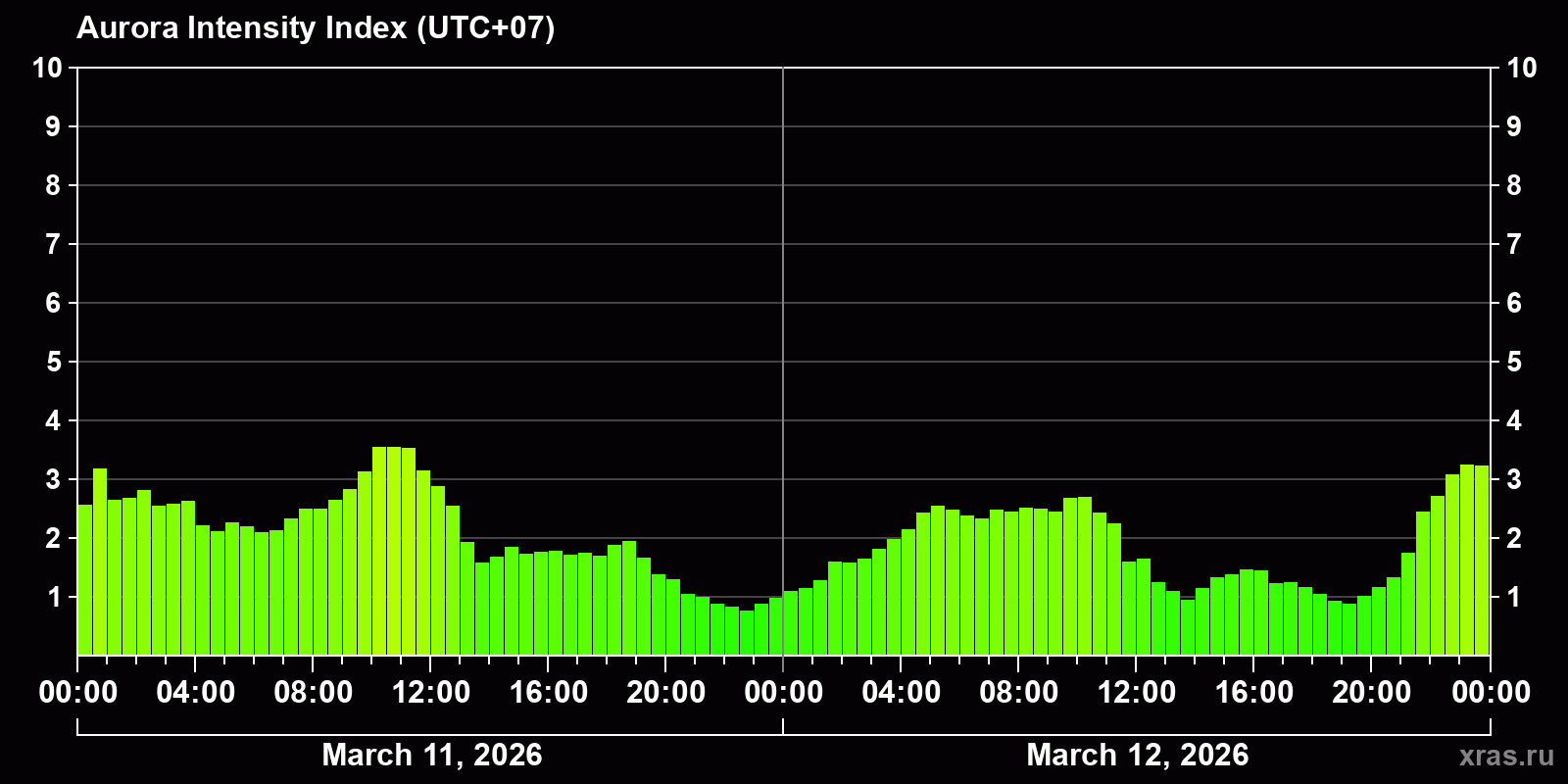 Changes in the auroral intensity index from 2026-03-11 to 2026-03-12 local time