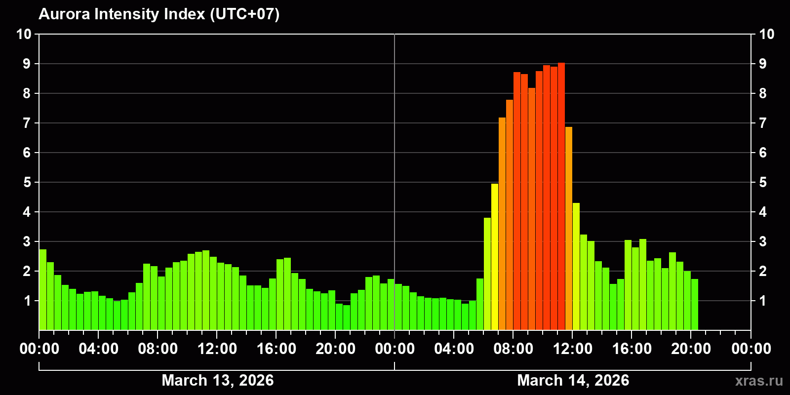 Changes in the auroral intensity index from 2026-03-13 to 2026-03-14 local time
