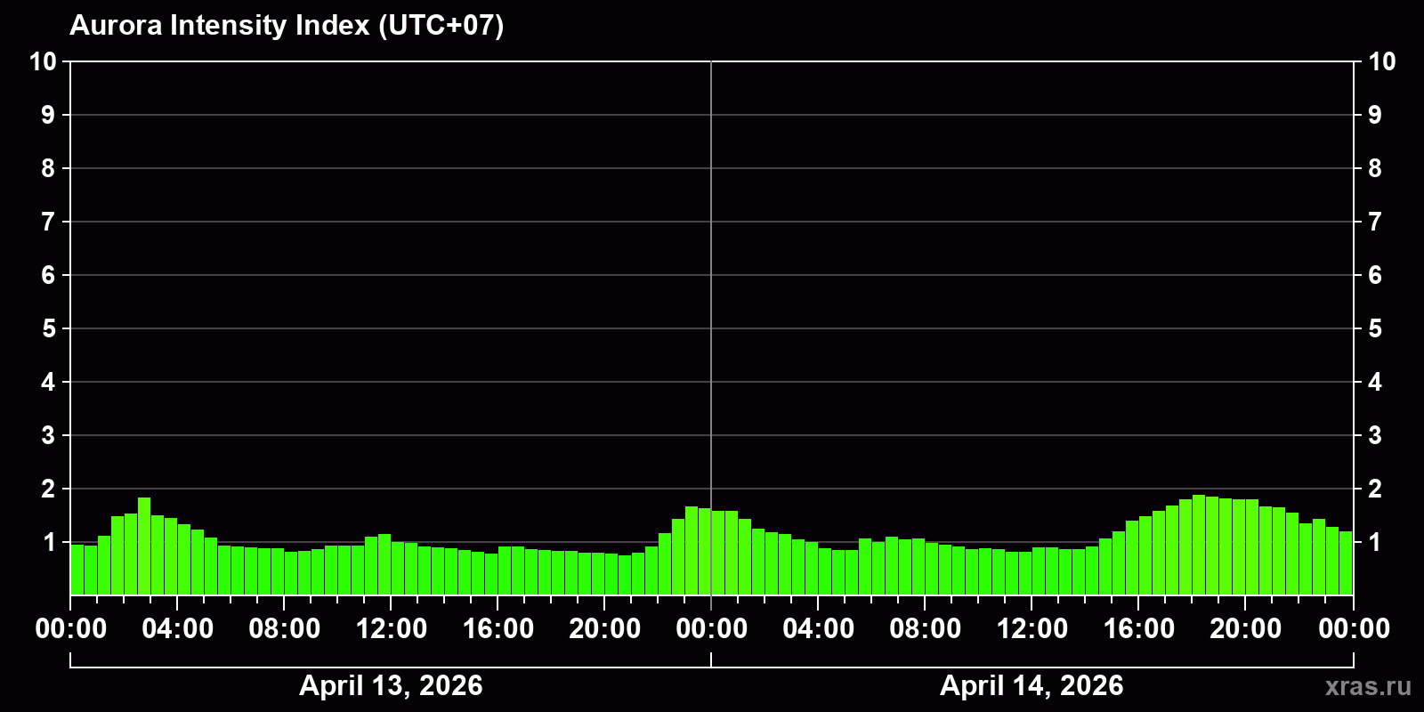 Changes in the auroral intensity index from 2026-04-13 to 2026-04-14 local time