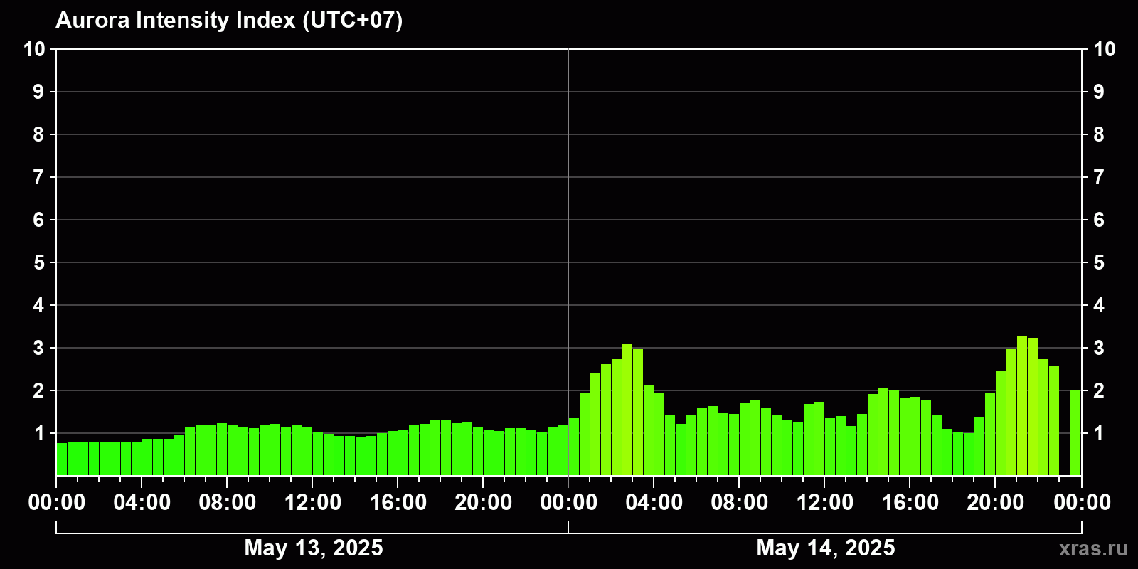 Auroral intensity index and the theoretically possible latitude of observations for nighttime in the Estern Hemisphere as of 2025-05-14 23:59 (end of day) local time