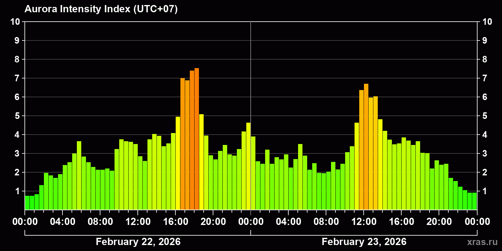 Auroral intensity index and the theoretically possible latitude of observations for nighttime in the Estern Hemisphere as of 2026-02-23 23:56 (end of day) local time