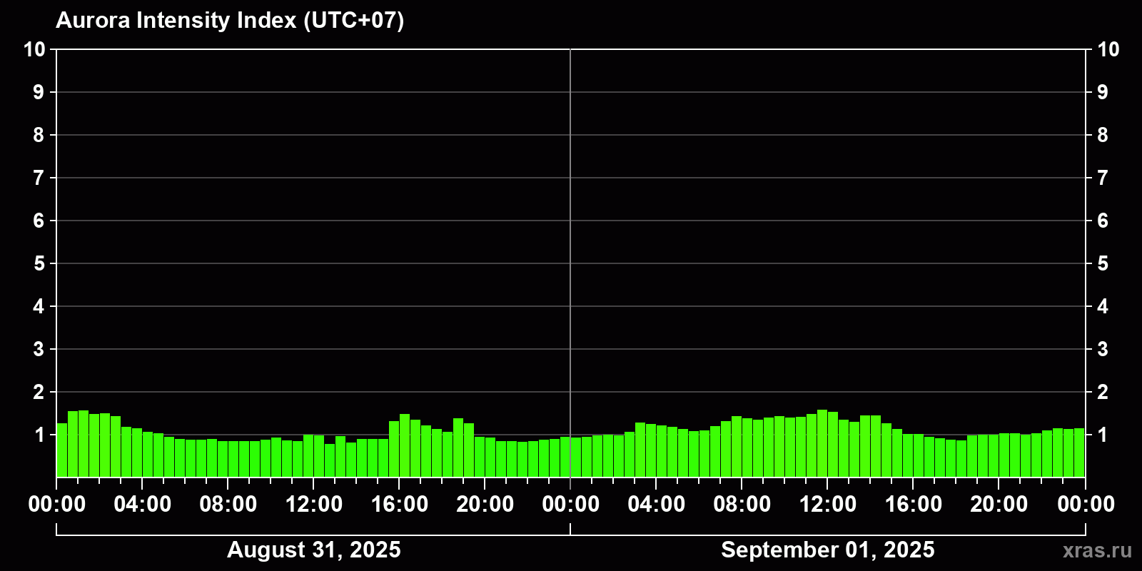 Auroral intensity index and the theoretically possible latitude of observations for nighttime in the Estern Hemisphere as of 2025-09-01 23:57 (end of day) local time
