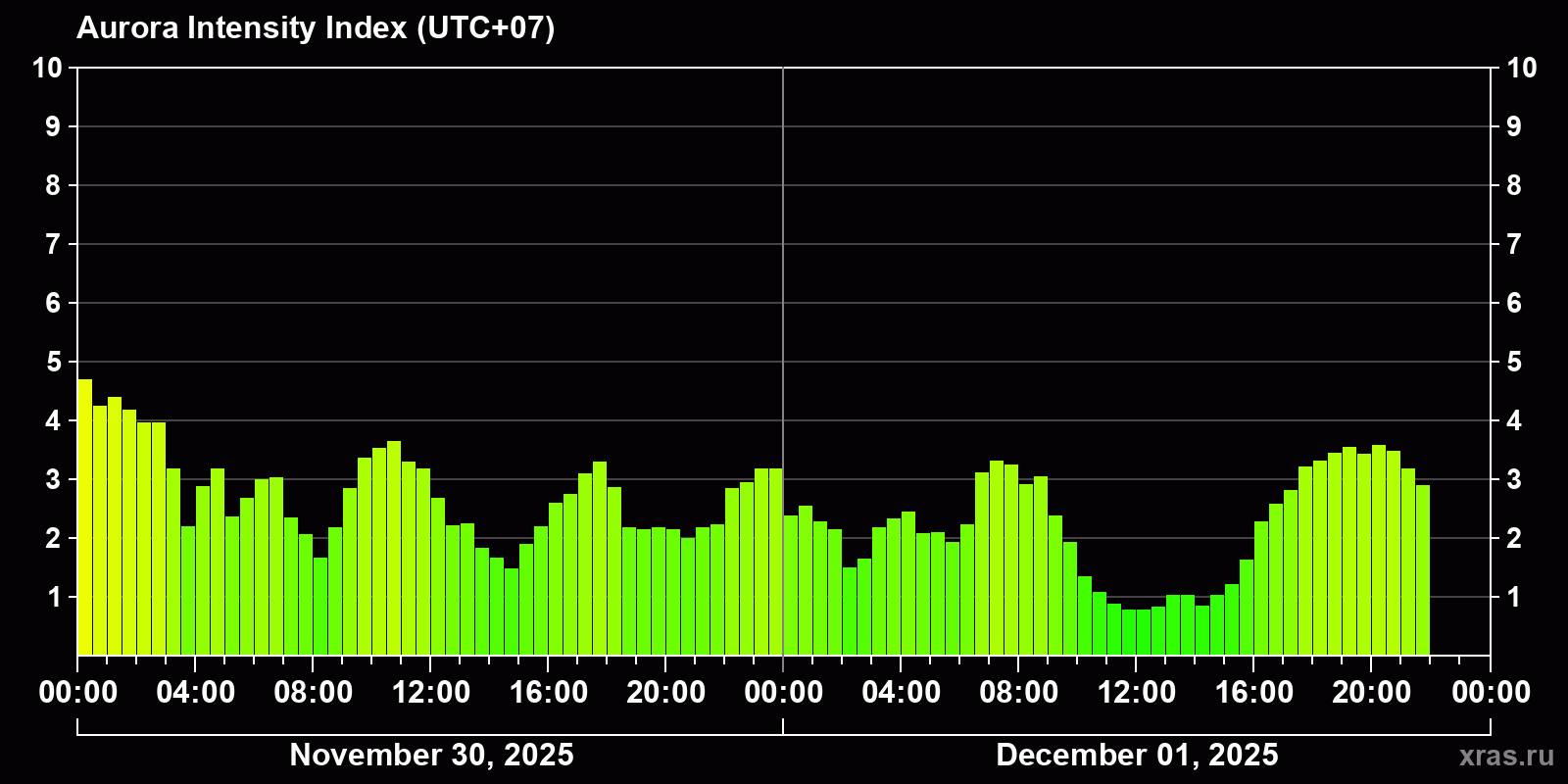 Auroral intensity index and the theoretically possible latitude of observations for nighttime in the Estern Hemisphere as of 2025-12-01 20:50 (end of day) local time